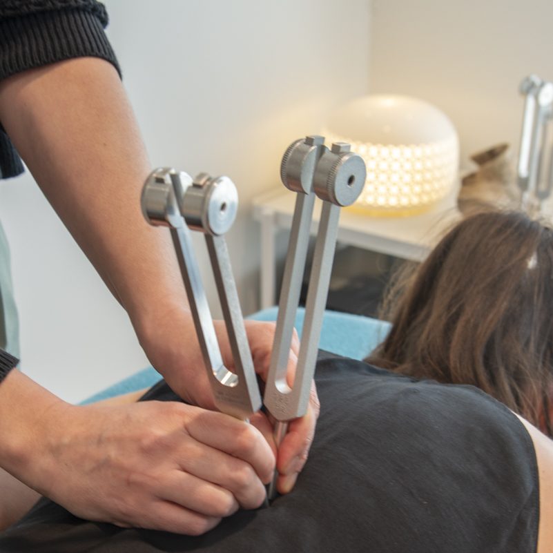 Les diapasons thérapeutiques sont activés puis posés délicatement le long de la colonne vertébrale, des cervicales jusqu’au sacrum. Ils sont appliqués sur le trajet du méridien de la vessie.